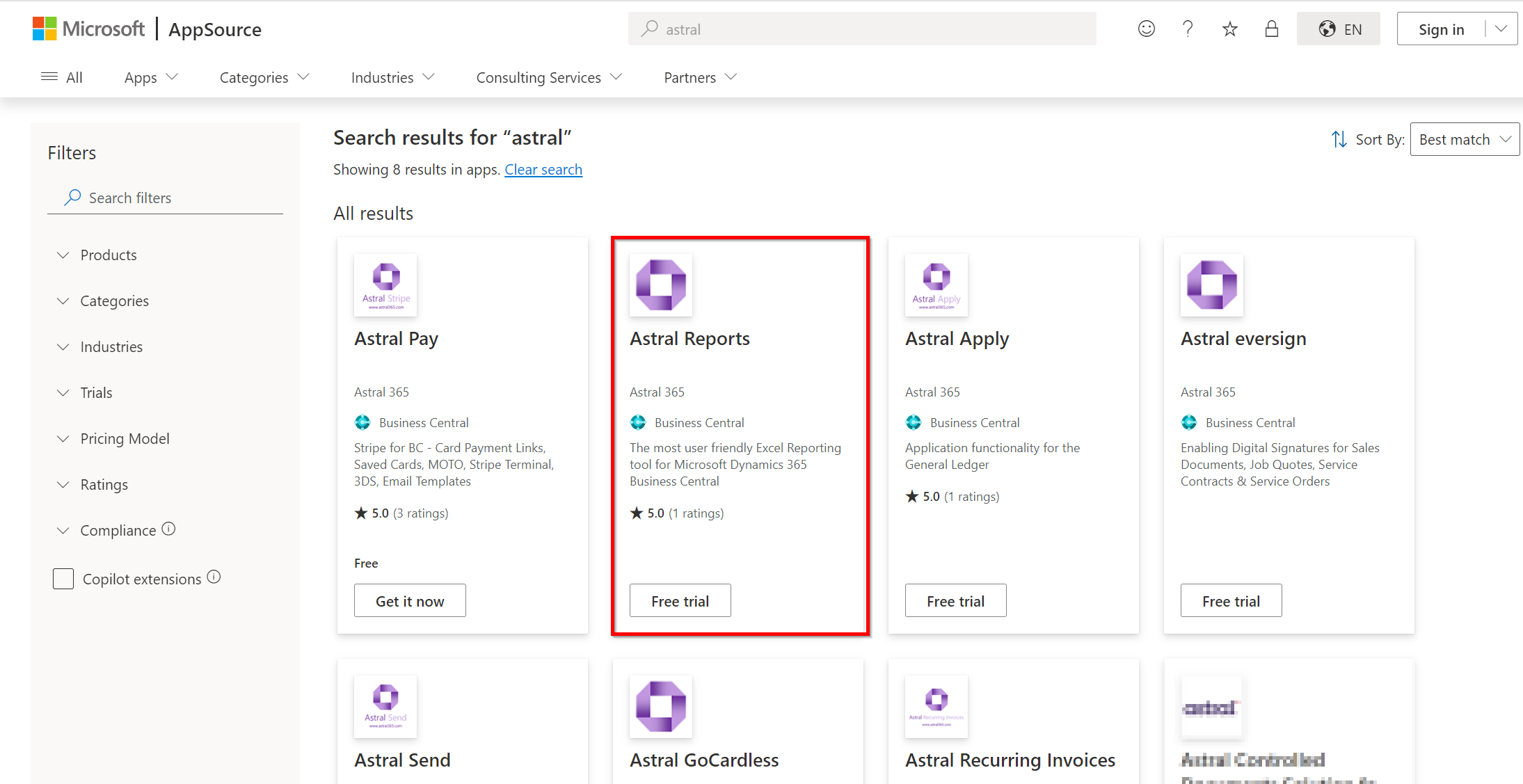 To install Astral Reports, visit Microsoft AppSource, and in the search bar type in 'Astral', selecting Astral Reports from the options that appear.
